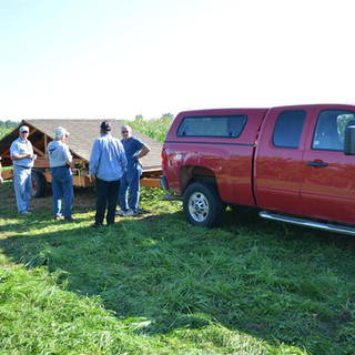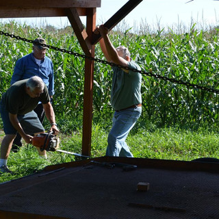 The farmer had offered to help us by loaning us a forklift to raise the roof so that we could remove the posts and lower it to the trailer. However, the day of the "move", the forklift had mechanical problems. That presented us with another challenge. It was decided that we would pull the trailer under the shelter, and then lower the shelter by going around it and shortening the posts about one foot at a time with a chain saw. As each post was cut, the roof would drop on that corner. The process continued until the roof was resting on the trailer. At that time, part of the roof was blocked up, and a sawzall was used to cut along the center truss, separating the roof into 2 halves.